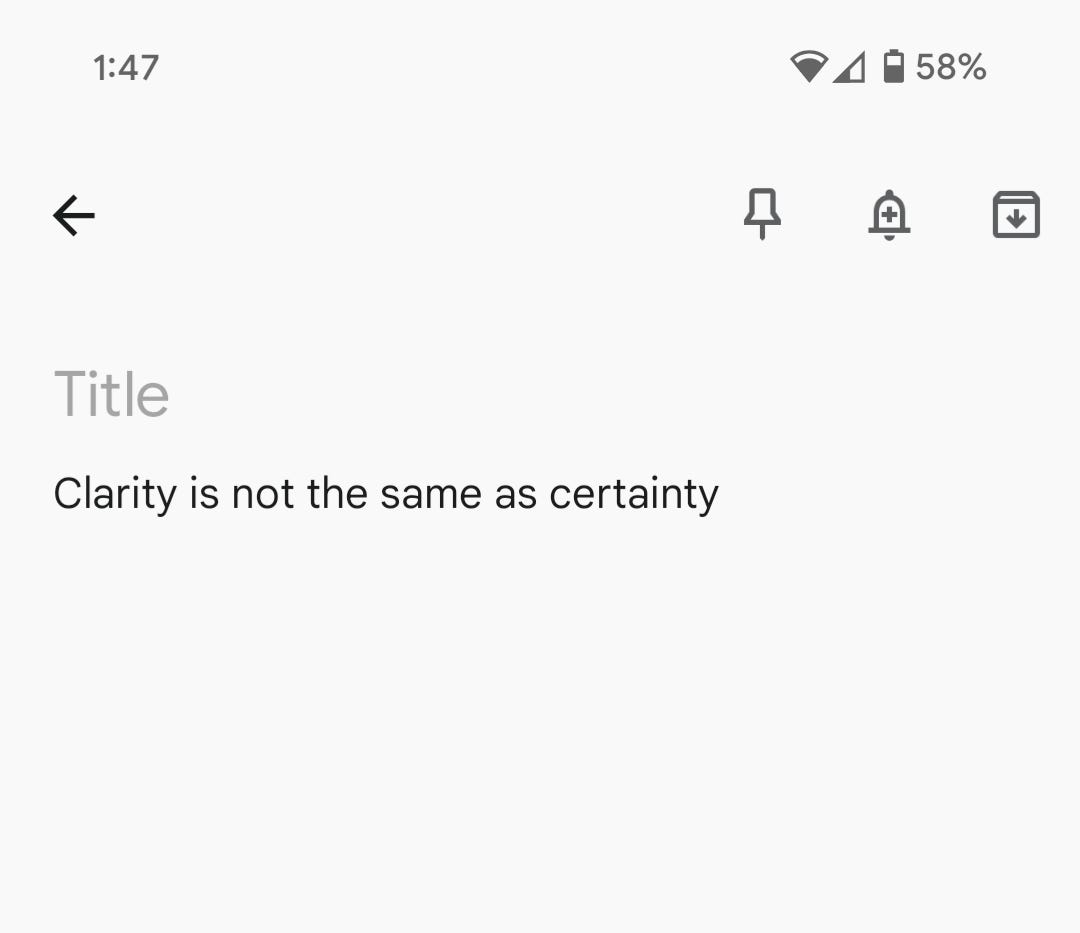 I’ve felt fortunate to have this mantra to carry with me over the past week. Remembering that I can have clarity about where we are at, while also acknowledging that the future, what will happen, is not clear. That the future is untold, and that this uncertainty, though scary of unsettling, is also a space of choice. Of looking at what is not known, and deciding who and how to be.